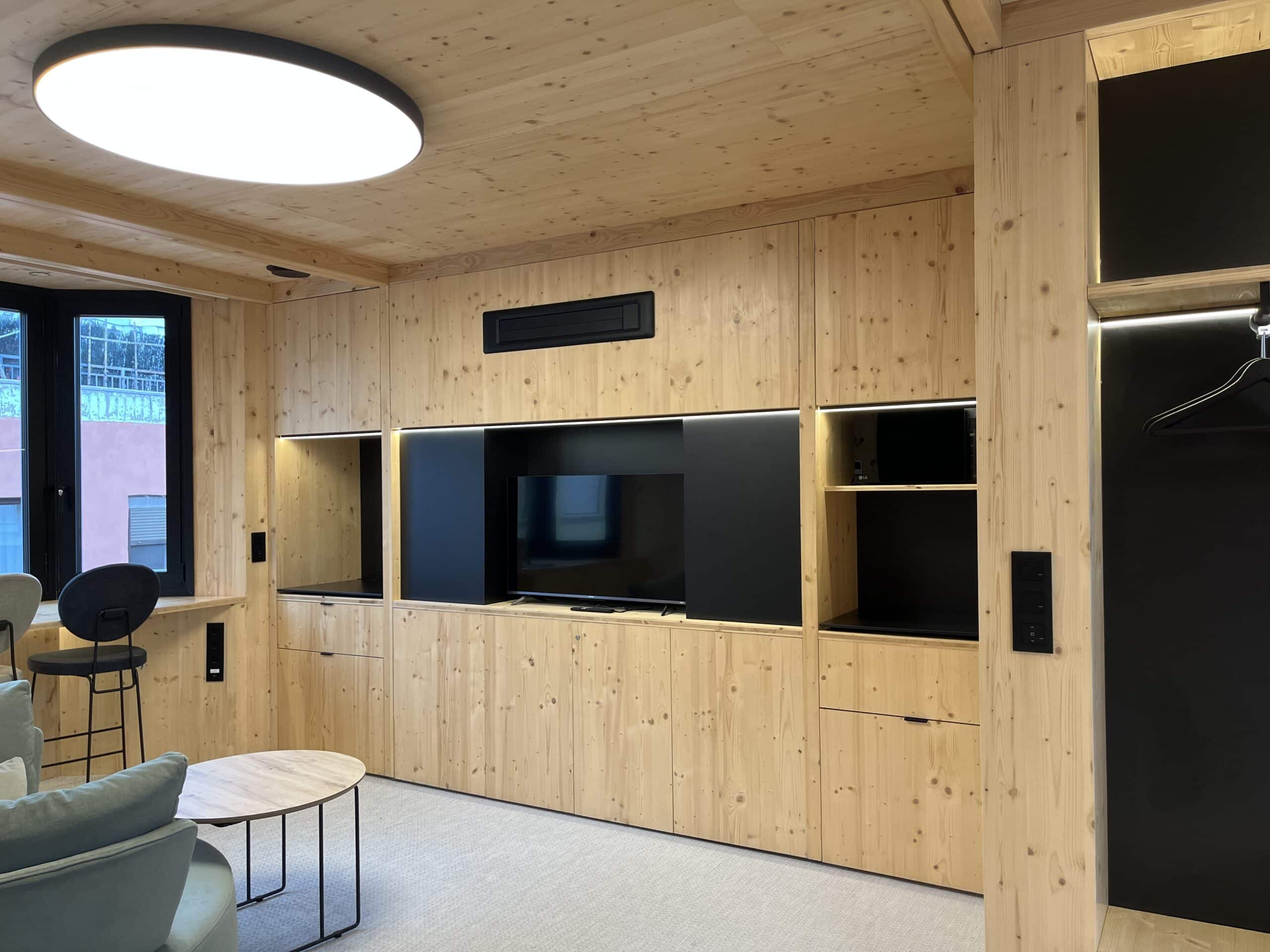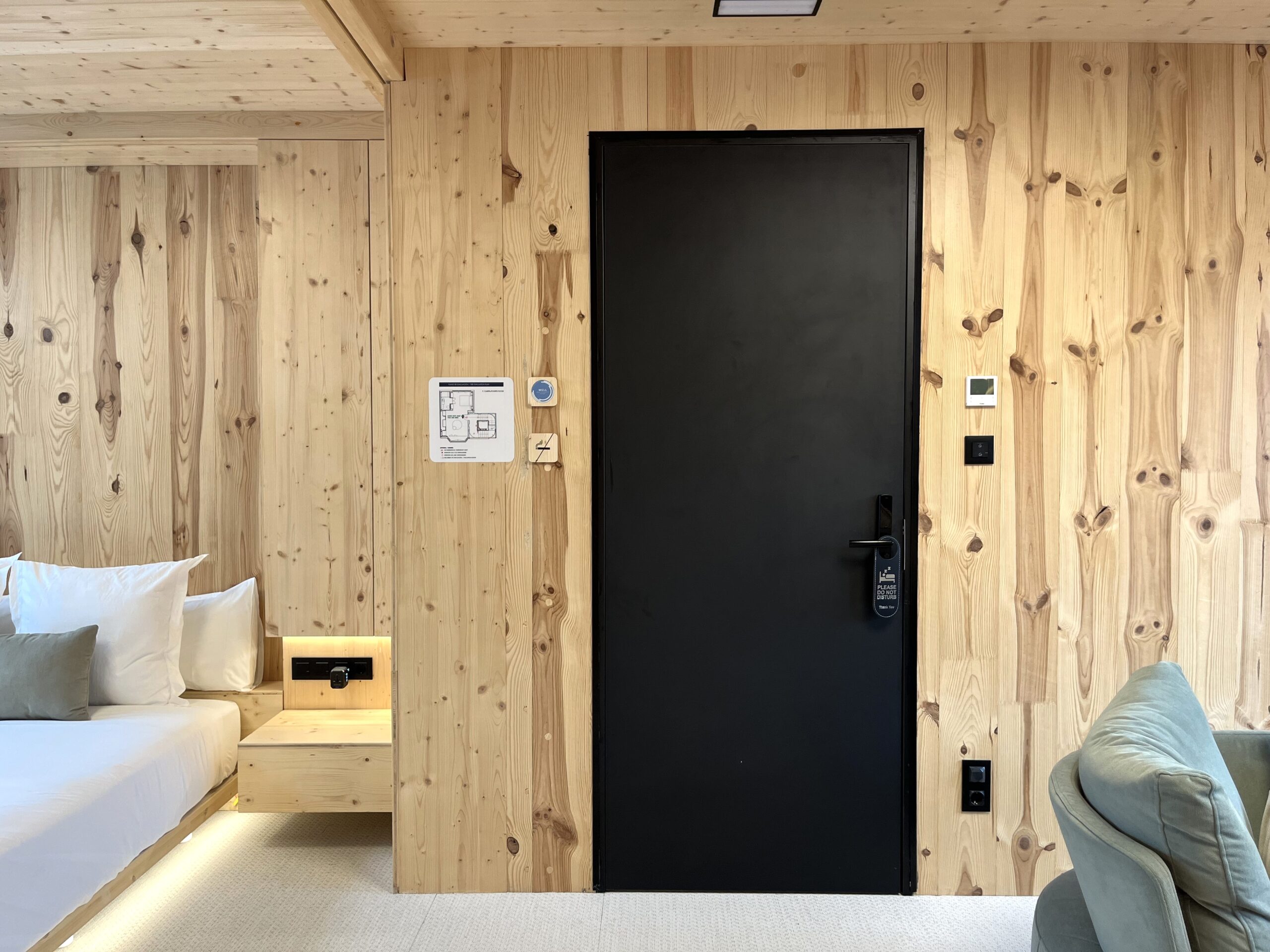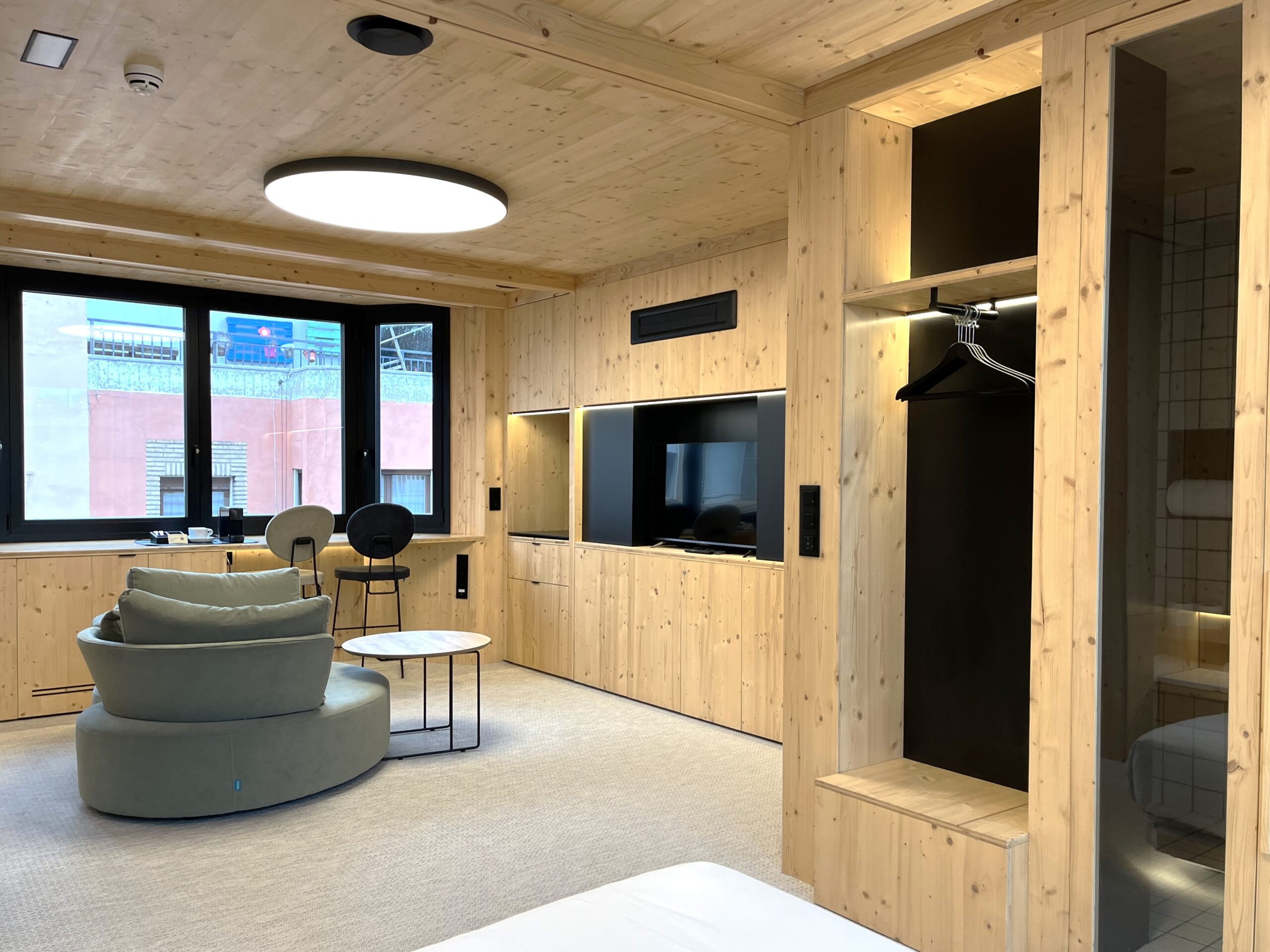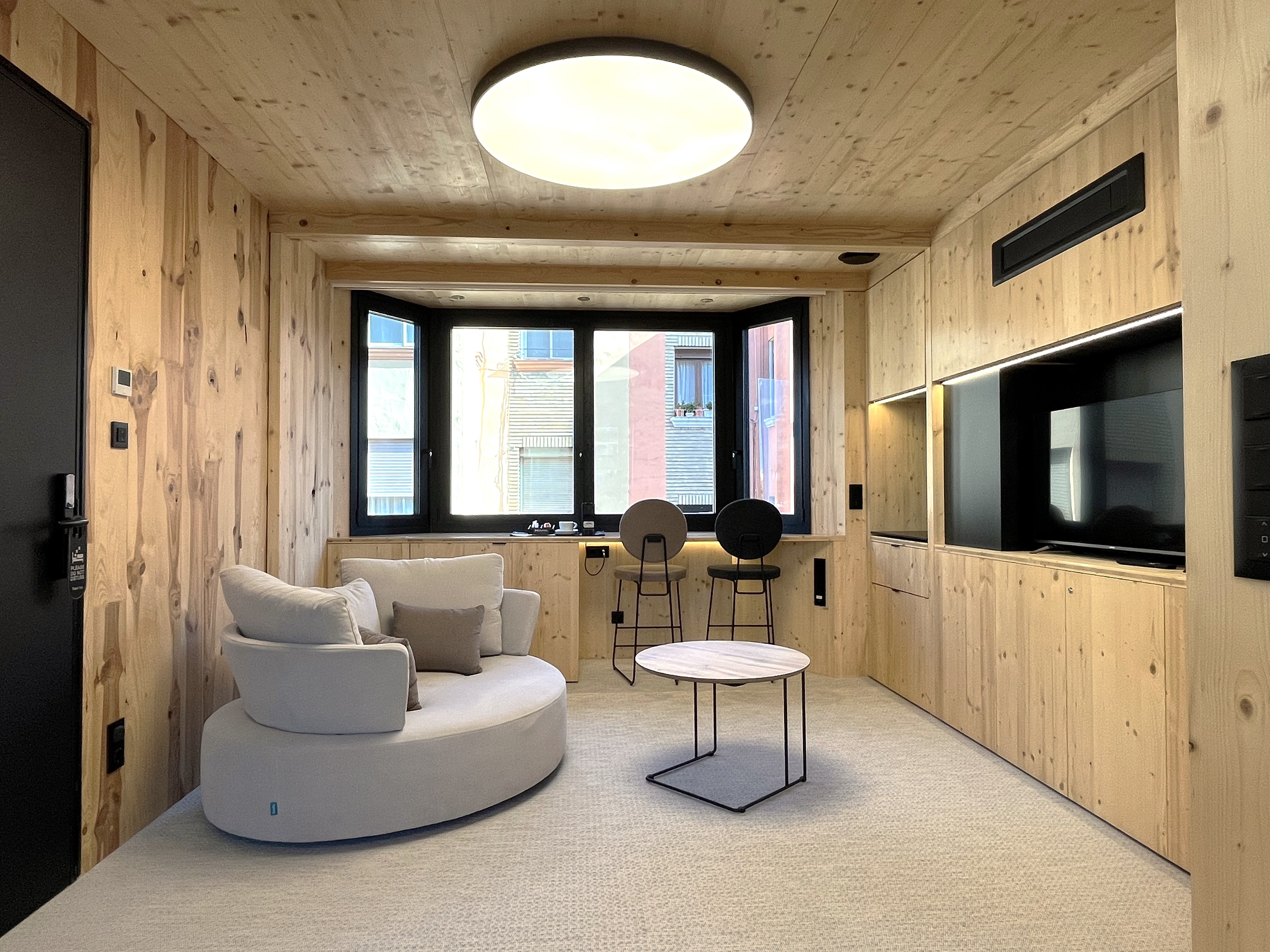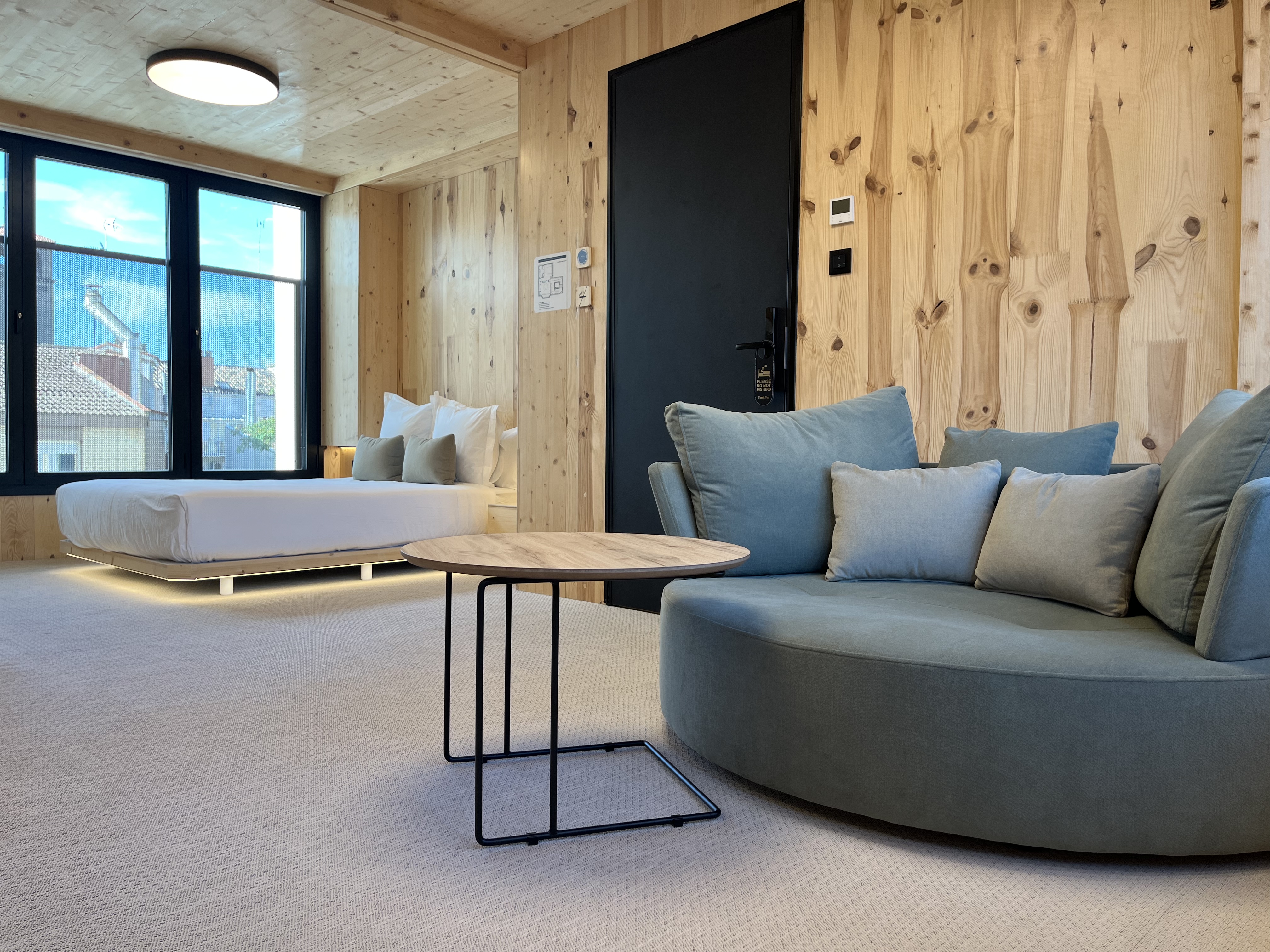 Nuestras suites combinan el alma histórica de Zaragoza con un diseño innovador y saludable, avalado por WELL Health-Safety Rating. Ubicadas en un edificio modular de vanguardia en pleno centro de la ciudad, estas habitaciones están concebidas para ofrecer una experiencia de descanso y bienestar superior. Predominan los materiales nobles como la madera natural, tonos neutros y detalles en colores inspirados en el arte mudéjar, creando un ambiente cálido, elegante y armonioso. El espacio se distribuye de forma inteligente: un salón abierto con office completamente equipado, un dormitorio acogedor y un baño moderno y funcional. Cada elemento ha sido pensado para favorecer tu confort, reducir el estrés y reconectar con tu equilibrio interior.